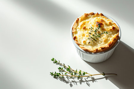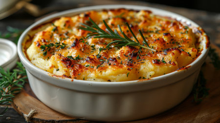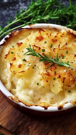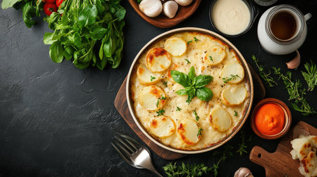 A beautifully arranged creamy potato gratin featuring fresh herbs and garlic, perfect for a gourmet meal. Elegant presentation ideal for food photography.
