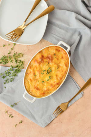 Composition with mashed potato casserole on color background