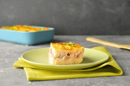 Plate with piece of mashed potato casserole on table, closeup