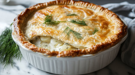 A homemade chicken pot pie sits on a marble counter, featuring a flaky crust and a filling of tender chicken and assorted vegetables, garnished with fresh dill.