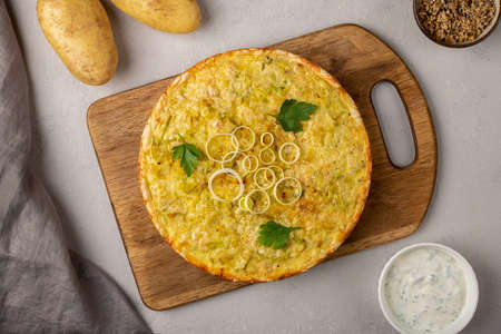 Quiche pie with leek, potatoes and cheese flat lay on gray concrete background and ingredients sour cream, onion rings on round wooden cutting board