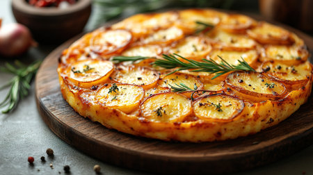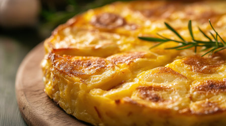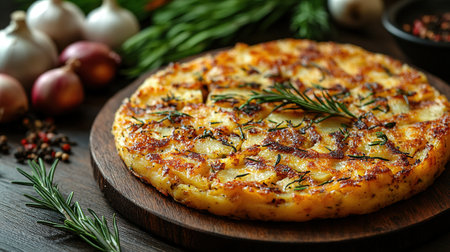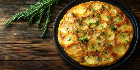 A freshly cooked Spanish tortilla sits on a wooden board, showing its inviting golden crust and layers of potatoes and eggs, garnished with rosemary in a warm kitchen.
