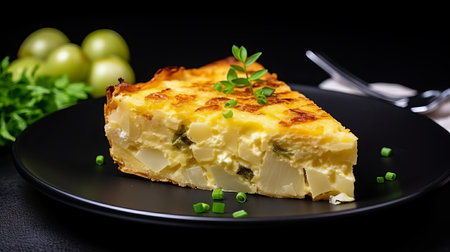 A slice of traditional Spanish tortilla, made with eggs and potatoes, is plated beautifully. Garnished with fresh herbs and set against a dark background, the dish looks appetizing and inviting.