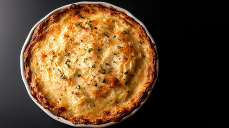 Top view of a hearty Shepherd's Pie with golden brown mashed potato crust, savory meat filling, and steam rising from the dish, AI Generated