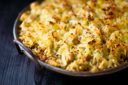 Fish pie, fisherman pie, made with white fish poached in a white sauce and topped with mashed potatoes, british cuisine