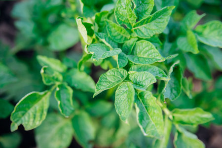 Potatoes are planted in rows on the field. Green foliage of potatoes soft focus