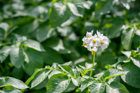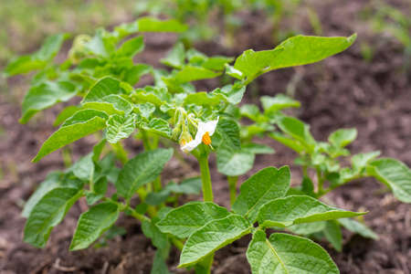 potato plant with white flowers on a vegetable bed. Growing and cultivating potatoes. Copy space.