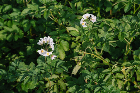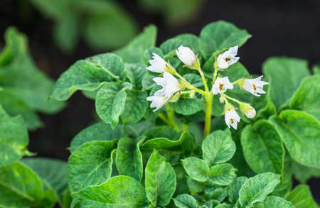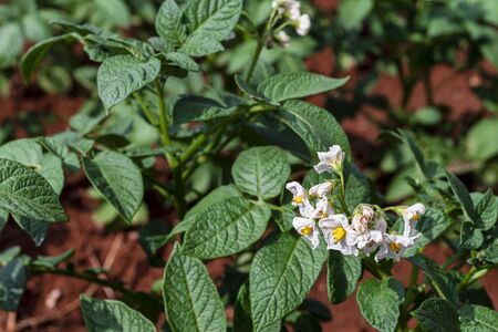 Blooming potatoes. Bushes of a plant with white small flowers. Valuable agriculture in the food industry.