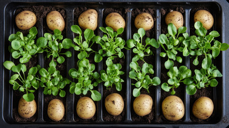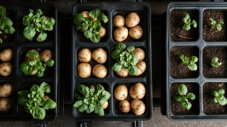 Seed potatoes of the Charlotte salad variety in chitting trays, top-down view, preparing for planting season.
