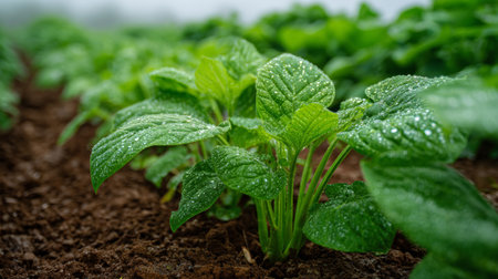 This image showcases fresh green leaves adorned with water droplets, captured in an agricultural field during a foggy morning, highlighting nature's beauty.