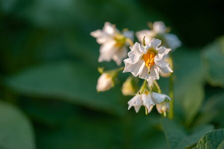 Flowering potatoes. Potato flowers blossom in sunlight grow in plant. White flower of blooming potato plant. Organic potato blossoms in the garden