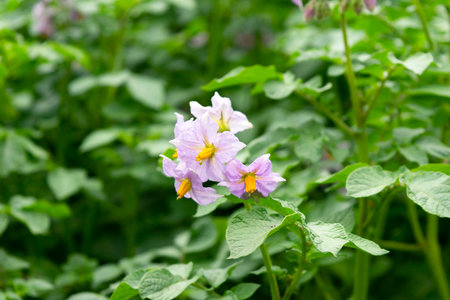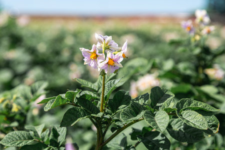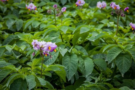 Potato field with blooming flowers of Solanum tuberosum