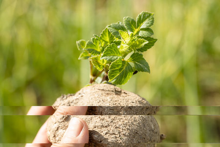 Sprout close-up. Soil with a young plant. Planting potato seedlings in the ground. The concept of nature conservation and agriculture.