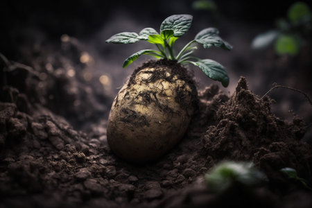 A close-up image of a potato sprouting in nutrient-rich, dark soil of a garden. AI