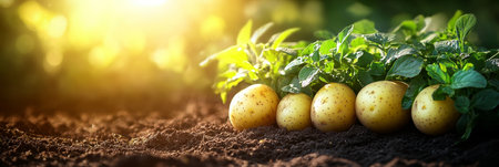 Fresh potatoes growing in soil