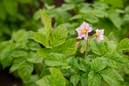 Flowering potato bush. Yellow-pink flower on a young green potato bush.