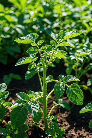 young potato plant growing on the vegetable bed