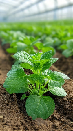 Young potato plants growing in rows on farm field in springtime