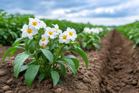 Potato plant blooming in a well-tended field with rows of growing crops under a cloudy sky