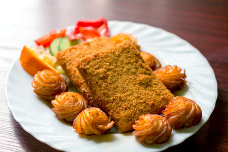 White plate with fried fish and potatoes, on a black background. still life