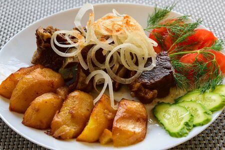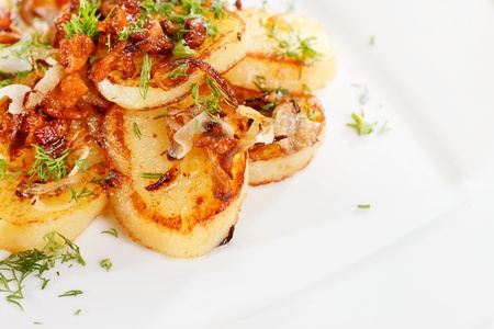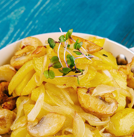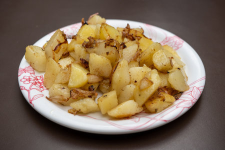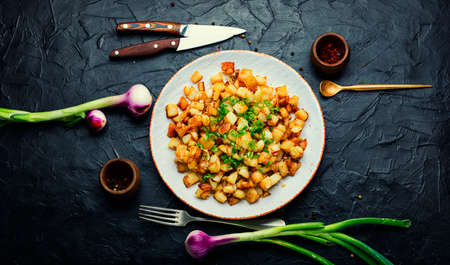 Appetizing fried potatoes.Roasted potatoes on the plate