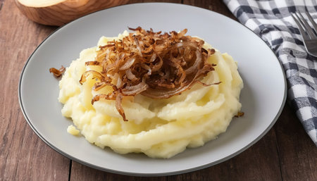 Mashed Potatoes with fried onions in plate