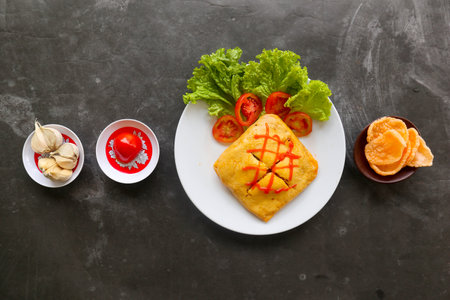 nasi goreng pattaya or Pattaya Fried Rice (Stuffed Omelette Fried Rice). Southeast Asian dish made by covering or wrapping chicken fried rice, in thin fried egg or omelette