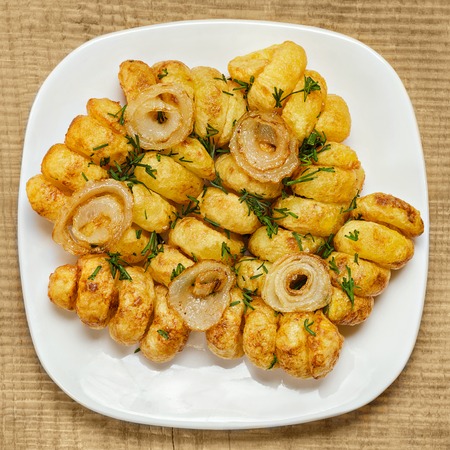 Roasted potatoes in a white bowl with rosemary and dill at next to fried onions and fish in batter on wooden background. Close-up rustic composition.