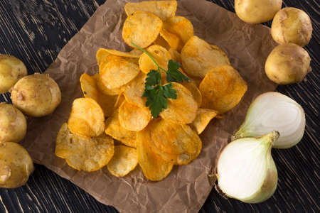 Potato chips, raw potato and onion on wooden background.