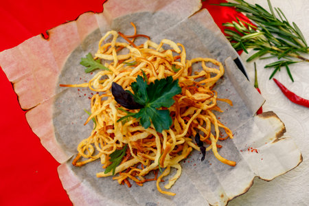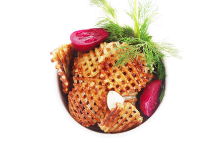 French-fried potatoes with greens and spices on plate