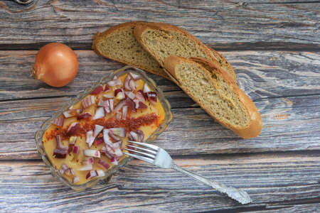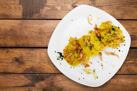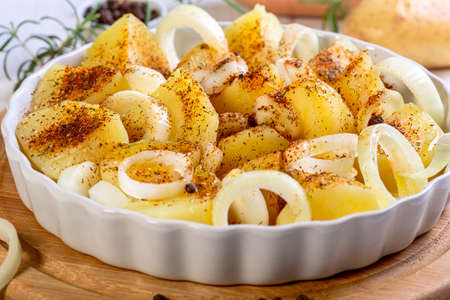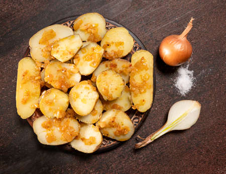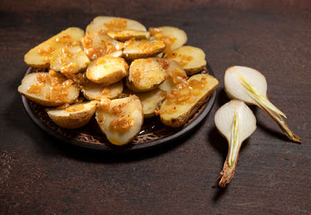 Homemade food concept. Baked potatoes with onion on a wooden background