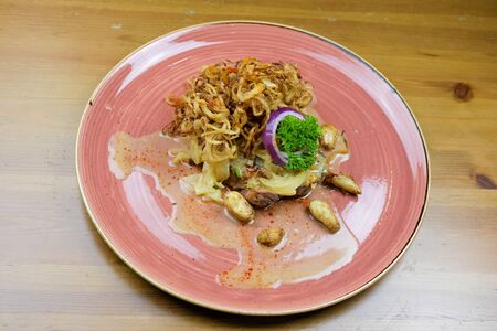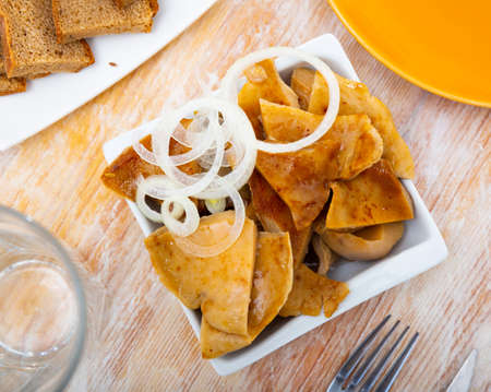Traditional portuguese cousine, cod fish onions with oil.