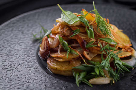 Fried potatoes with garlic and herbs on a black plate on a black background