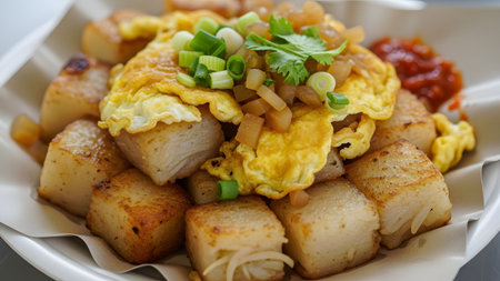 A close-up of fried radish cake cubes (Chai Tow Kway) stir-fried with eggs and preserved radish, served with chili sambal. This golden-brown dish is a popular hawker food in Singapore and Malaysia.