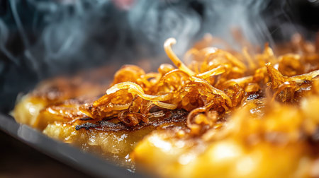 Indulge in this close-up image of crispy fried bananas topped with golden fried shallots, capturing the steam and tantalizing aroma, ideal for food lovers.