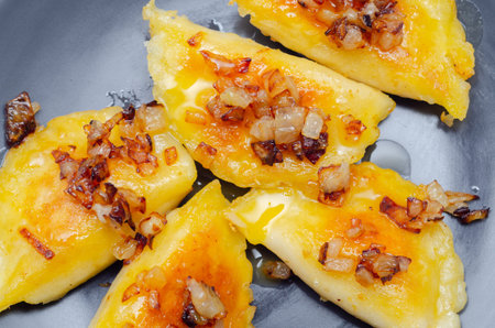 Close up of dumplings sprinkled with fried onion, traditional Polish, Russian and Ukrainian cuisine, tasty dish
