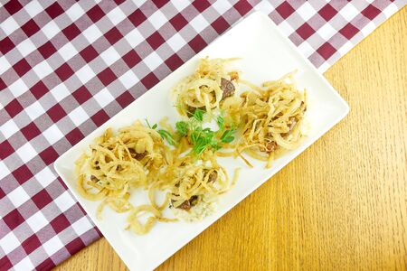 potato pancakes with fried onion rings and sour cream sauce, created with generative ai
