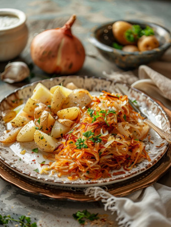 A beautifully arranged selection of fresh ingredients including chopped potatoes, onions, and herbs, perfect for inspiring culinary creativity in the kitchen.