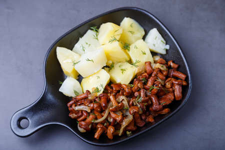 Chanterelle mushrooms with boiled potatoes, onions, dill and oil in a small black pan. Traditional Russian dish. Black background, close-up, camera zoom.