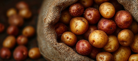 A bunch of potatoes are piled up in a bag. The potatoes are of different colors, including red, yellow, and brown. The bag is made of burlap, giving the scene a rustic and natural feel