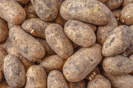 Old dirty potato dug from the ground, scattered on the surface