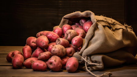 raw potatoes on wood. new harvest of vegetables in burlap bag. rustic food.
