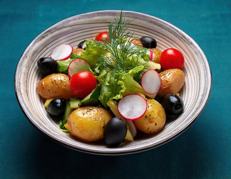 Potato salad with radish, olives and tomatoes in bowl
