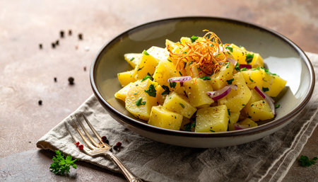 A hearty serving of German potato salad, made with boiled potatoes, vinegar, bacon, and onions, served warm.