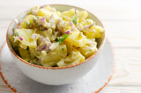 Cold potato salad with purple onion, gherkins and parsley in a white bowl on the table. Traditional German dish concept. Selective focus. Horizontal orientation. copy space.