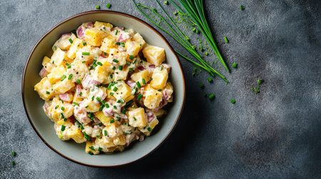 Top view of German kartoffelsalat with chives, arranged with room for copy on a plain backdrop.