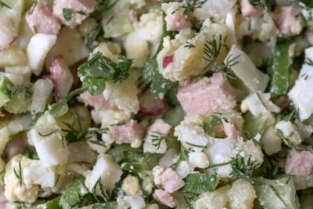 Vegetable salad with sausage, boiled eggs and potatoes, cucumbers, radishes, parsley and dill. It is used with bread kvass and sour cream as a cold first course.