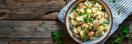 Potato salad with chicken and fresh herbs on rustic wooden background