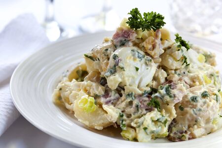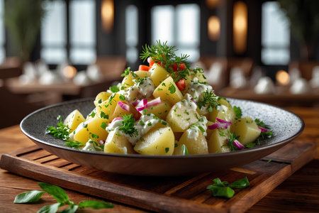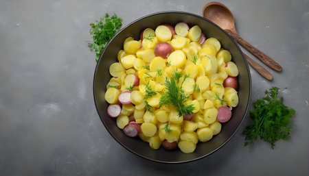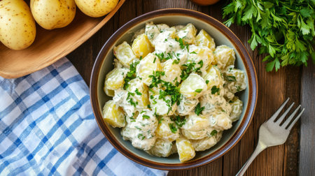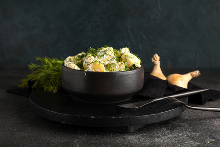 Potato salad with mustard, dill and garlic - a traditional German salad for Oktoberfest, New Year and Christmas