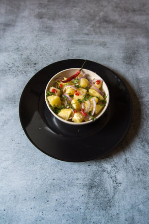 Indian snacks aloo jeera or boiled potatoes mixed with pepper and chopped onions.